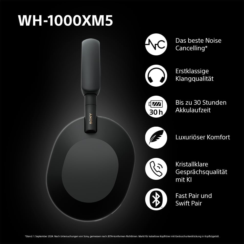 Der Sony WH-1000XM5 ist ein kabelloser Over-Ear-Kopfhörer mit branchenführender aktiver Geräuschunterdrückung. Er verfügt über zwei Prozessoren und acht Mikrofone, die Umgebungsgeräusche effizient erfassen und reduzieren. Die 30-mm-Treibereinheit liefert klare Höhen, ausgewogene Mitten und kräftige Bässe. Mit einer Akkulaufzeit von bis zu 30 Stunden und Schnellladefunktion (3 Minuten laden für 3 Stunden Wiedergabe) ist er besonders reisefreundlich. Multipoint-Verbindung, Touch-Steuerung, LDAC-Unterstützung und Sprachassistenten-Kompatibilität runden das Funktionspaket ab.